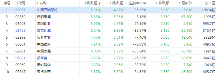 截至发稿,中国石油股份A股涨5.91%,H股现涨4.87%;药明康德A股涨5.88%,H股现涨5.25%;洛阳钼业A股涨5.07%,H股现涨4.77%。
