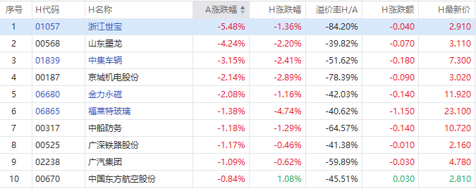 浙江世宝A股跌超5%,H股现微跌1.36%;山东墨龙A股跌超4%,H股现跌2.20%;中集车辆A股跌超3%,H股现跌2.41%。
