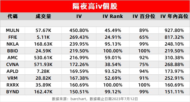 2、散户抱团股近期呈井喷的走势,再度点燃了市场热情。隔夜再成为期权交易的热门标的, $CVNA 、 $NKLA 、 $AMC 、 $BYND 当前的隐含波动率处于150%以上。