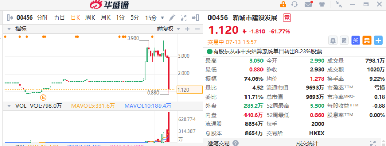 7月13日讯,新城市建设发展(00456)午后闪崩,一度跌超70%。截至发稿,跌58.7%,报1.21港元,成交额988.6万港元。