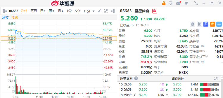 “周杰伦概念股”巨星传奇首日上市涨23.76%,报5.26港元。该股此次IPO发售价为4.25港元,公开发售部分获约12.99倍认购,估计自全球发售收取的所得款项净额将约为2.45亿港元。据悉,巨星传奇被称为“周杰伦概念股”,其业务分为新零售、IP创造及营运,均深度绑定周杰伦。自创立开始,公司参与策划周杰伦的世界巡回演唱会《地表最强》,先后担任周杰伦演唱会的策划服务供应商、宁波巨星行动超级夜的策划服务供应商及投资方,并成为以周杰伦为核心的真人秀节目《周游记》的主创。公司拥有周游记IP、周杰伦二次元人物形象“周同学”商标,与泡泡玛特合作卖“周同学周游记”盲盒。