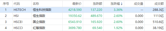 7月13日消息,港股延续大涨行情。截至收盘,恒生指数涨2.6%报19350.62点,恒生科技指数涨3.82%,国企指数涨2.6%,三大指数均实现4连涨行情。