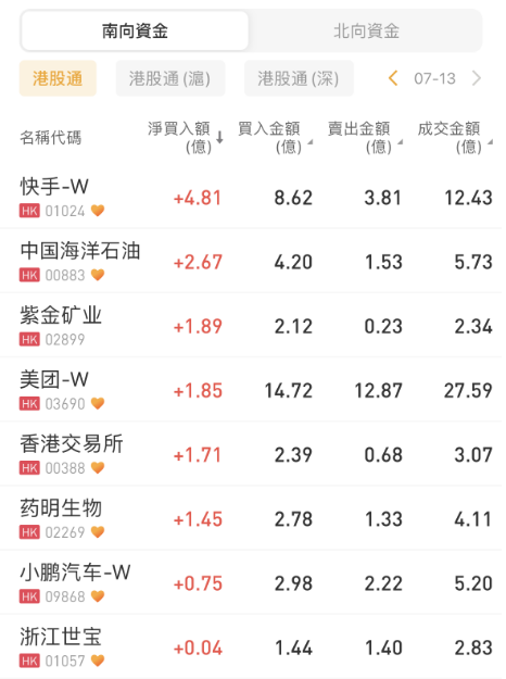 快手-W、中国海洋石油、紫金矿业分别获净买入4.81亿港元、2.67亿港元、1.89亿港元;腾讯控股、汇丰控股遭净卖出4.09亿港元、2.91亿港元。