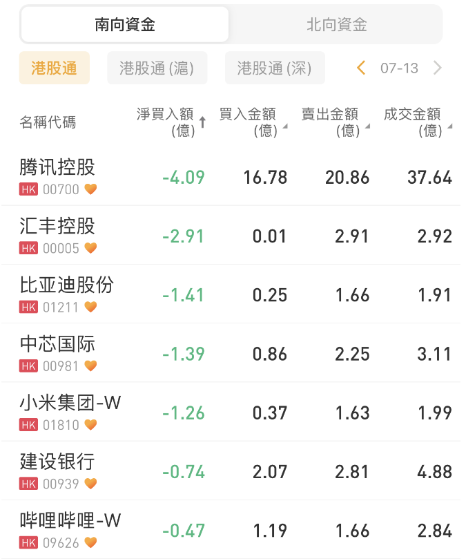华盛资讯7月13日讯,南下资金今日净卖出港股3.27亿港元,其中港股通(沪)净卖出15.14亿港元,港股通(深)净买入11.87亿港元。