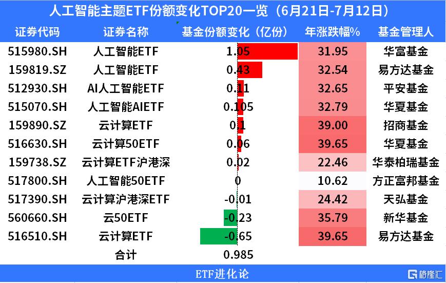 从AI主题ETF的份额变化来看,在AI回调期间,相关主题ETF份额整体呈现上升态势,其中华富基金人工智能ETF份额增加1亿份。