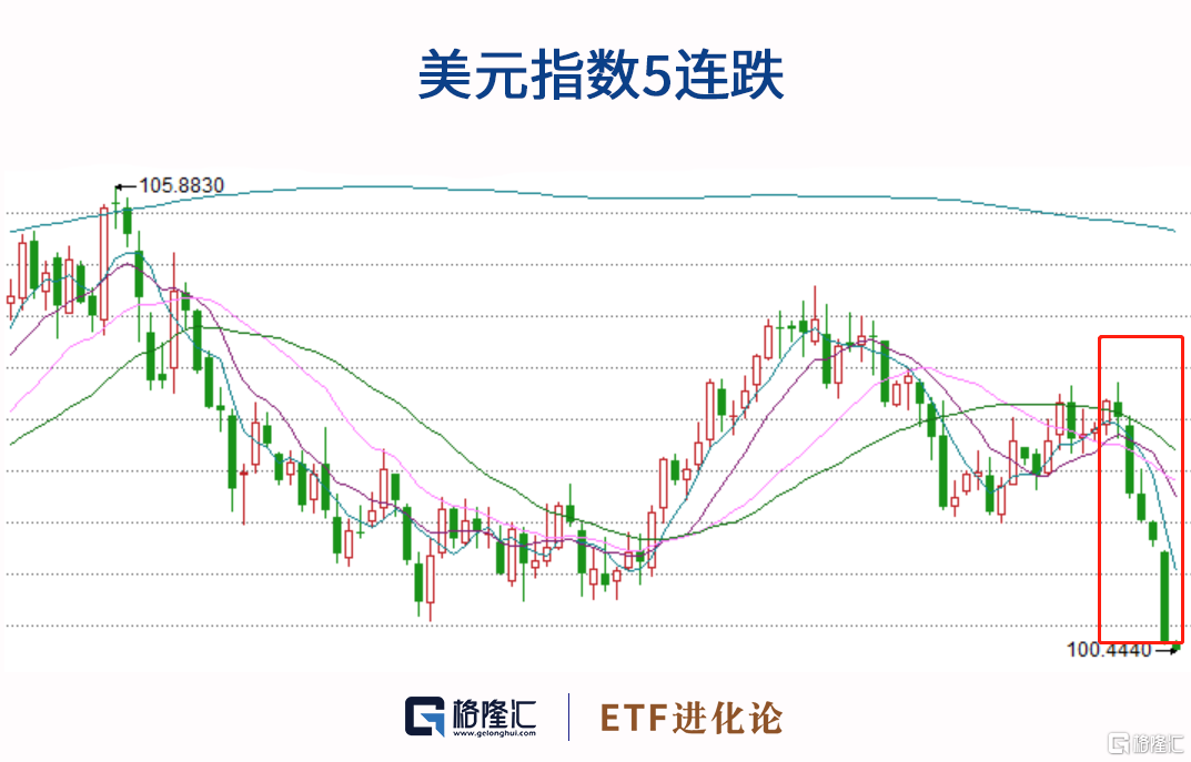 从日K线来看,美元指数最近走出5连跌的奇景,昨日更是拉出一条长阴线。这似乎证明了看跌美元浪潮的合理性。