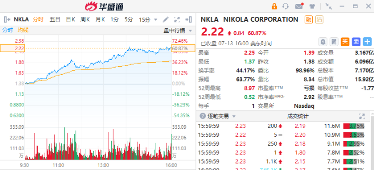 在这一消息的提振下,Nikola股价在周四盘中一度达到2.25美元,这是自2月底以来的最高交易水平,并使该股重回200天移动平均线上方。此外,该股收涨60.87%也是自2020年6月以来的最大单日涨幅。