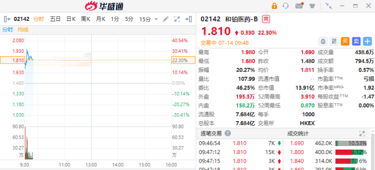 和铂医药-B(02142)早盘冲高,截至发稿,涨22.3%,报1.81港元,成交额794万港元。