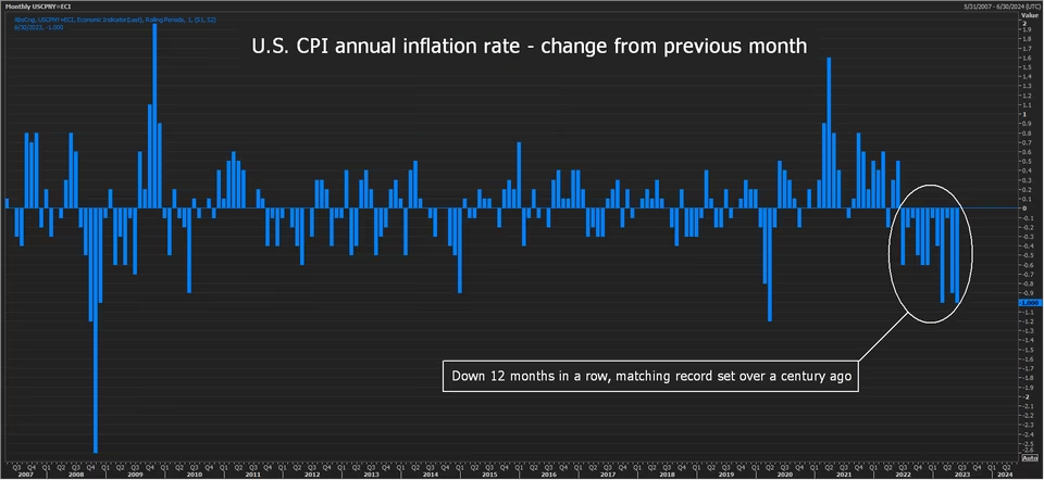 美国CPI连续12个月下跌,追平了一个多世纪前创下的纪录