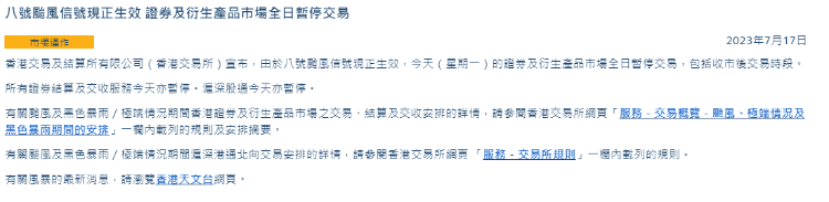 华盛资讯7月17日消息,香港交易所宣布,由于八号台风信号现正生效,今天(星期一)的证券及衍生产品市场全日暂停交易,包括收市后交易时段。所有证券结算及交收服务今天同时暂停。沪深股通今天也暂停。