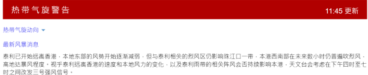 此外,香港天文台11:45表示,台风“泰利”已开始远离香港,视乎泰利远离香港的速度和本地风力的变化,以及泰利雨带的相关阵风会否持续影响香港,天文台会考虑在下午四时至七时之间改发3号强风信号(目前是8号东南烈风或暴风信号热带气旋警告)。