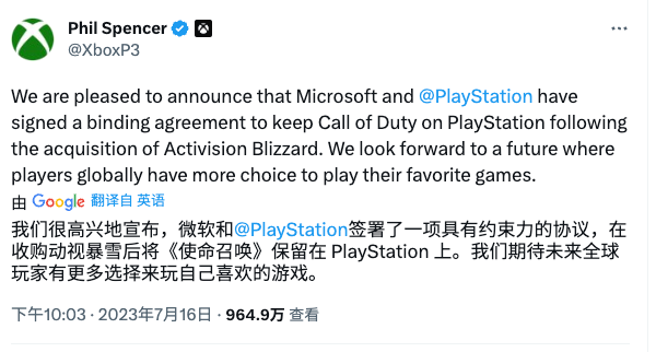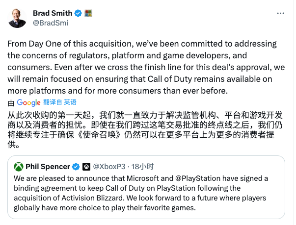 从此次收购的第一天起,我们就一直致力于解决监管机构、平台和游戏开发商以及消费者的担忧。即使在我们跨过这笔交易批准的终点线之后,我们仍将继续专注于确保《使命召唤》可以在更多平台上发行。