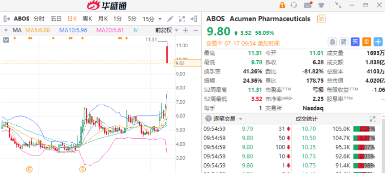 Acumen Pharmaceuticals $ABOS 涨超55%,现报9.8美元。此前宣布ACU193取得积极结果,在早期阿尔茨海默病患者中耐受性良好。