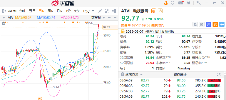 动视暴雪涨3%,现报92.77美元。微软与索尼达成协议,确保《使命召唤》系列游戏继续登陆PlayStation平台