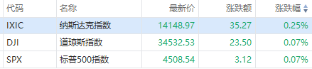 华盛资讯7月17日消息,美股三大股指走高。截至发稿,道指涨0.07%,标普500指数涨0.07%,纳指涨0.25%。