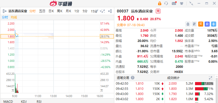 华盛资讯7月18日消息,远东酒店实业复牌一度暴涨逾42%,截至发稿,涨28.57%,报1.8港元,成交额3536万港元。