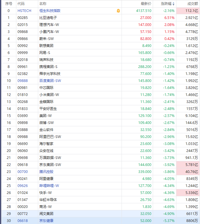 个股方面,比亚迪电子涨逾6%,理想汽车-W涨超2%,小鹏汽车-W涨逾1%,蔚来-SW跟涨;百度集团-SW、小米集团-W、中芯国际跌超1%,美团-W、阿里巴巴-SW跌超2%,腾讯控股、京东集团-SW跌超3%,华虹半导体、快手-W、哔哩哔哩-W跌超4%。
