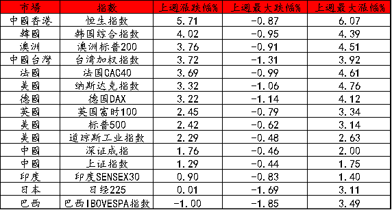 上周全球股指数上涨,港股显著反弹。美国三大指数转涨,道琼斯上涨2.29%,报34509,纳斯达克上涨3.32%,报14113,标普500上涨2.42%,报4505。欧洲股指亦明显反弹,其中涨幅度最大的是法国CAC40指数上涨3.69%,报7374;其次是德国DAX指数上涨3.22%,报16105;英国富时100指数上涨2.45%,报7434。恒生指数上周上涨5.71%,报19414。恒生科技指数上涨8.39%,报4229。上证指数上涨1.29%,报3237;深证成份指数上涨1.76%,报11080。费城半导体指数按周上涨12.4%,报3750。芝加哥期权交易所波动指数(VIX)按周下跌11.5%。
