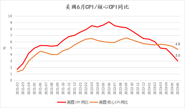 6月美国CPI同比升3%,低于市场预期的3.1%和前值的4%。季调后CPI环比升0.2%,前值升0.1%,低于市场预期升0.3%。核心CPI同比升4.8%,前值升5.3%,市场预期升5.0%。季调后核心CPI环比升 0.2%,低于预期的0.3%和前值的0.4%。核心通胀降温是由于二手车和卡车价格环比增速降至-0.5%,结束连续两个月上涨,及租金环比增速降至0.4%,前三月均为0.5%。
