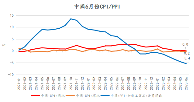 7月10日国家统计局数据显示CPI同比降至0,前值0.2%,为2021年3月以来最低。核心CPI同比0.4%,前值0.6%,为2021年4月以来最低。食品价格延续季节性回落,环比下降0.5%,高温、降雨天气影响了鲜菜供给,使其价格由上月下降3.4%,转为本月上涨2.3%,其他食品整体价格环比降幅均在1.2%-2.6%之间。预计随着收储工作将再度开启,猪肉价格或企稳,但去年同期基数走高,食品CPI同比压力持续。工业品价格继续承压,6月PPI同比-5.4%,降幅继续扩大,前值-4.6%。我们认为PPI的持续下跌主要是由于海外持续性的货币紧缩所导致,加息导致全球商品价格显著下跌,但海外加息或已进入到尾声,下半年PPI趋势同比将较为平缓。