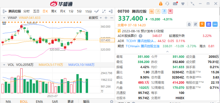 上周腾讯 $00700.HK 连升5日,突破350港元水平收市,并于上周五曾高见354.8港元,创近一个月高位。昨日港股因台风关系休市,今日复市后腾讯结束5连升,截至发稿,最低见336.2港元。有报导指腾讯大股东Prosus料其所持腾讯股份的比例,将于今年底降至约24%至25%,并将每年减少2至3个百分点。