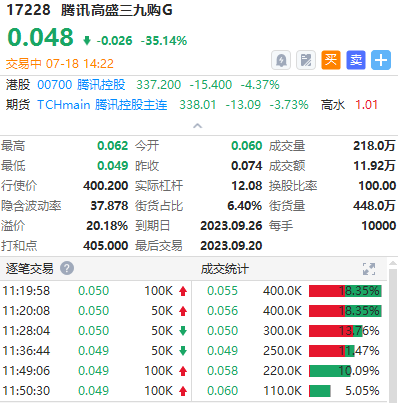 腾讯购17228 $17228.HK ,行使价400.2港元,2023年09月26日到期,实际杠杆12.3倍,高杠杆、低面值