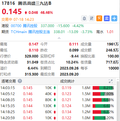 腾讯沽17816 $17816.HK ,行使价329.8港元,2023年09月26日到期,实际杠杆9.6倍,高杠杆