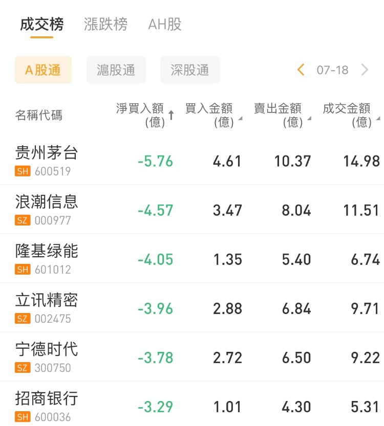北向资金今日大幅净卖出87.65亿元。贵州茅台、浪潮信息、隆基绿能分别获净卖出5.76亿元、4.57亿元、4.05亿元。药明康德净买入额居首,金额为2.92亿元。