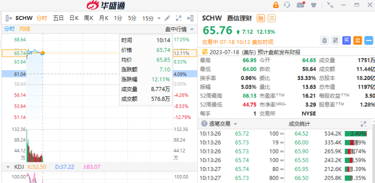 嘉信理财涨超12%,第二财季净营收46.6亿美元,调整后每股收益75美分,皆超市场预期。