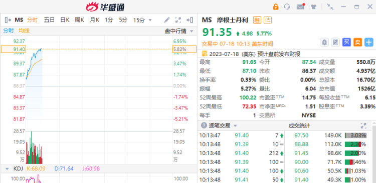 摩根士丹利涨幅扩大至5.7%,Q2,净营收134.6亿美元,每股收益1.24美元,均超预期;财富管理业务收入66.6亿美元创纪录新高。