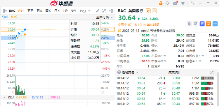 美国银行涨超4%,Q2营收252.5亿美元,每股收益0.88美元,均超预期;全球银行业务收入同比增长29%。