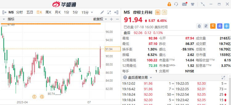由于交易和投资银行业务的放缓,摩根士丹利的盈利受到影响。二季度,该行的收入增长2%,达到约135亿美元,超过130.2亿美元的预期;利润下降13%,至21.8亿美元;每股收益为1.24美元,超过了分析师预期的每股1.15美元。