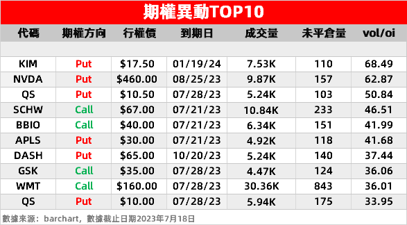 1、嘉信理财:绩后股价大涨超12%,公司Q2业绩下滑低于预期,EPS盈利虽降23%但高于市场预期。周二该股看涨期权最高涨超1100%,行权价为67美元的末日期权遭市场疯抢,成交量超10万张。