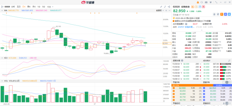 截至收盘,安踏体育跌1.83%,报82.95港元。