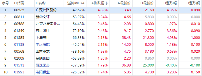 截至发稿,广深铁路股份A股涨4.82%,H股现涨4.35%;上海复旦A股涨2.13%,H股现涨4.93%;中远海能A股涨2.11%,H股现涨1.18%;洛阳钼业A股涨1.74%,H股现涨3.28%。