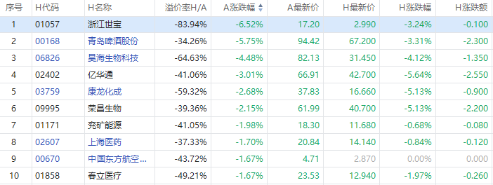 浙江世宝A股跌超6%,H股现跌3.24%;青岛啤酒股份A股跌超5%,H股现跌3.31%;康龙化成A股跌2.68%,H股现跌5.13%。