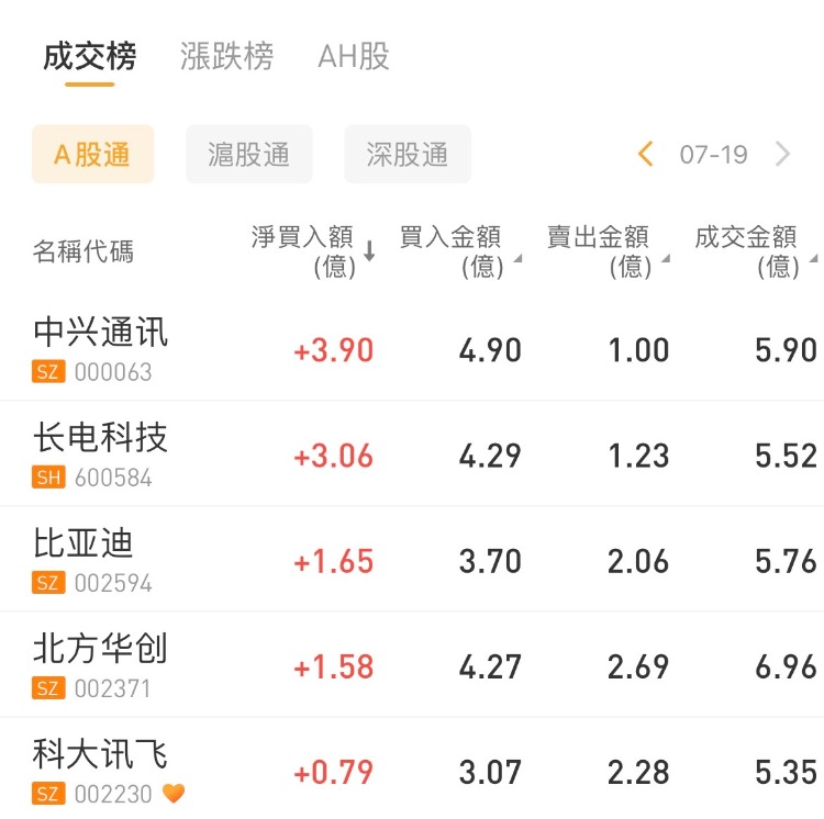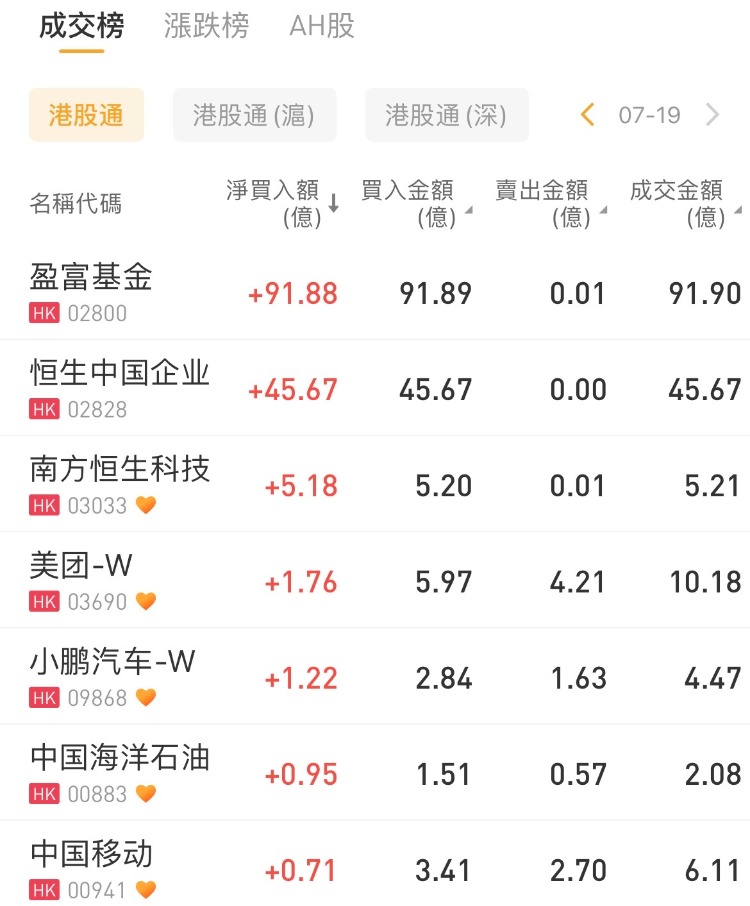 华盛资讯7月19日讯, 南向资金今日大幅净买入164.78亿元,其中港股通(沪)净买入75.02亿港元,港股通(深)净买入89.76亿港元。北向资金今日净卖出49.32亿元。
