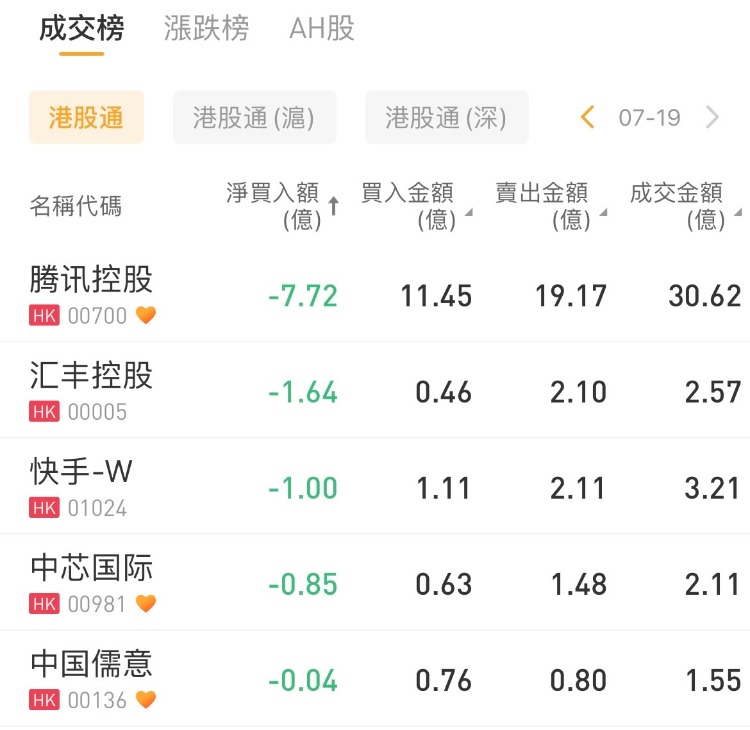 腾讯控股、汇丰控股、快手-W分别遭净卖出7.72亿港元、1.64亿港元、1亿港元;盈富基金获大手笔净买入91.88亿港元,恒生中国企业也获净买入45.67亿港元,增持美团-W 1.76亿港元。