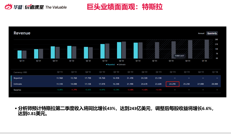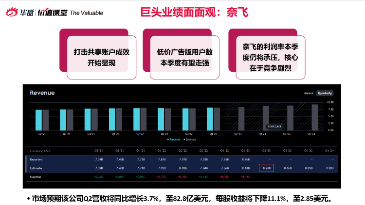 近期特斯拉股价经历了一定涨幅,二季度销售有望超越预期。预计二季度特斯拉的利润将比市场预期更强劲,原因在于降价趋势减缓,原材料成本下降。奈飞的利润率可能仍受竞争压力影响,尤其关注用户增长情况,如果用户增速超预期,即使收益低于预期,股价有望稳定上行;而如果用户增长低于预期,则可能面临股价回调压力。