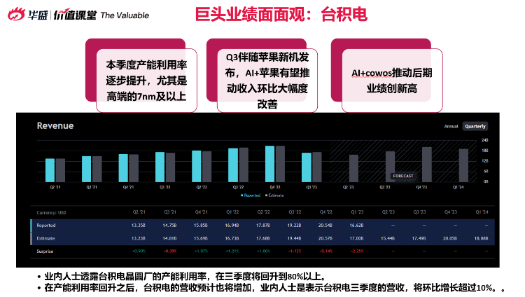 台积电预计产能利用率将逐步提升,特别是在七纳米及以上领域,伴随苹果新机发布,预计下个季度收入将大幅改善。其次,台积电的先进封装技术也被看好,预计三季度的产能利用率将回升到80%以上,主要受益于人工智能加苹果等领域的需求。整体而言,台积电相对其他芯片龙头表现较弱,但若有调整,可能是一个较好的介入时机。