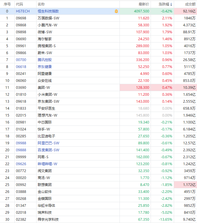 个股方面,万国数据-SW涨超2%,微博-SW涨逾1%,腾讯控股、美团-W、小米集团-SW、京东集团-SW跟涨;百度集团-SW、阿里巴巴-SW、哔哩哔哩-W小幅下跌,舜宇光学科技重挫逾13%,瑞声科技跌超5%,华虹半导体、金蝶国际、金山软件跌超2%。