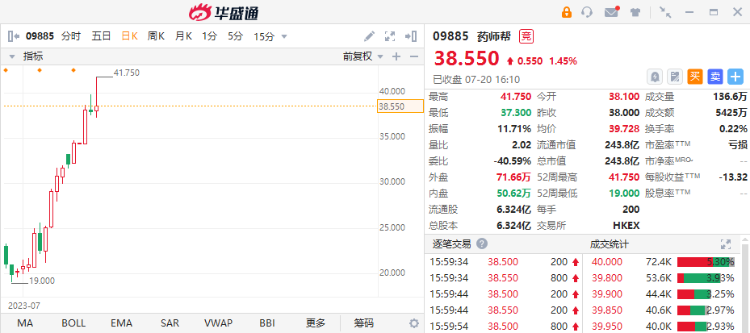 - 根据香港联交所7月12日披露的文件,Tiger Global Private Investment Partners XI, L.P.于6月28日以每股均价7.8港元场外增持药师帮8,000万股普通股股份,价值约6.24亿港元。增持后,该机构最新持股数目为8,000万股股份,好仓比例由0.00%升至12.65%。