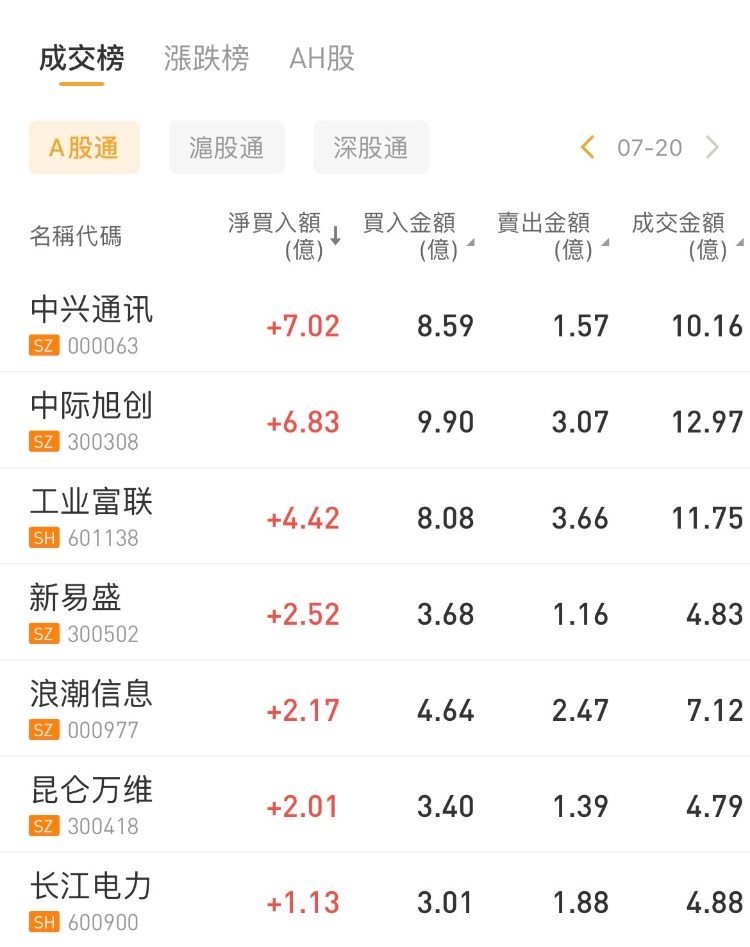 北向资金今日净买入3.47亿元。中兴通讯、中际旭创、工业富联分别获净买入7.02亿元、6.83亿元、4.42亿元。隆基绿能净卖出额居首,金额为2.48亿元。