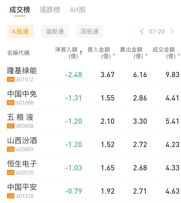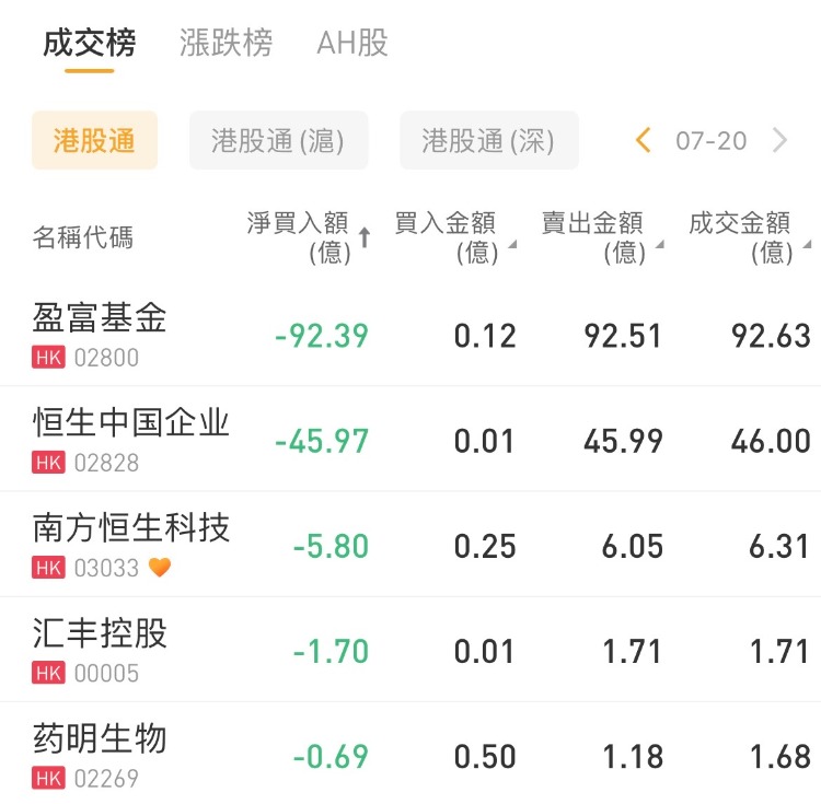 华盛资讯7月20日讯, 南向资金今日大幅净卖出138.34亿元,其中港股通(沪)净卖出58.84亿港元,港股通(深)净卖出79.49亿港元。北向资金今日净买入3.47亿元。