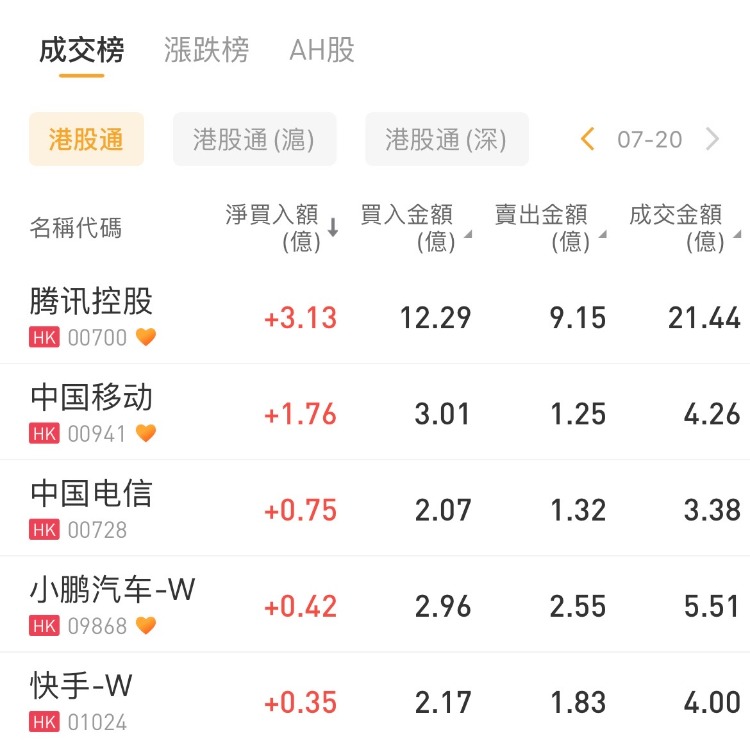 腾讯控股、中国移动、中国电信分别被净买入3.13亿港元、1.76亿港元、0.75亿港元;盈富基金遭大幅沽出92.39亿港元,恒生中国企业也遭净卖出45.97亿港元,甩卖汇丰控股1.7亿港元。