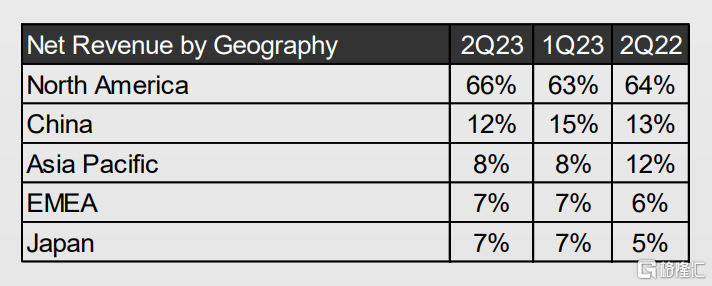 从地域来看,来自北美地区客户的营收占总净营收的66%,而来自中国、亚太地区、欧洲、中东和非洲地区(欧洲、中东和非洲)和日本分别占总净收入的12%、8%、7%和7%。