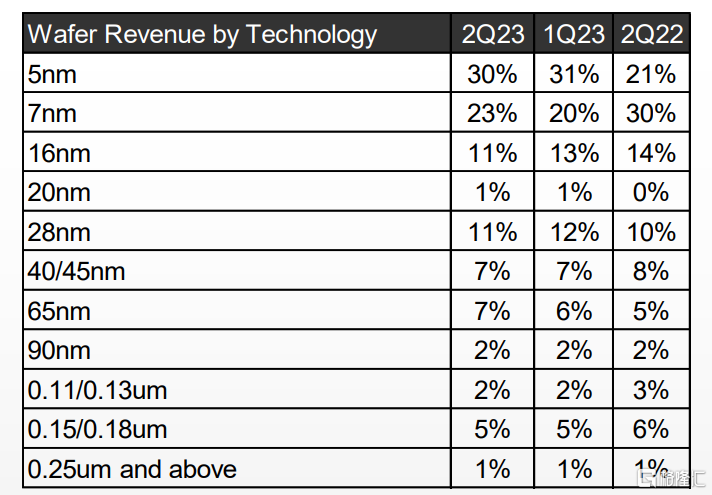 分开来看,按技术划分,5nm工艺技术贡献了2Q23硅片总收入的30%,而7nm工艺占23%。先进技术(7nm及以下)占硅片总收入的53%。