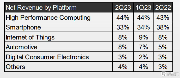 按平台划分,高性能计算和智能手机分别占净收入的44%和33%,而物联网、汽车、DCE和其他分别占8%、8%、3%和4%。从环比来看,高性能计算、智能手机、物联网和其他业务的收入分别比第一季度下降5%、9%、11%和5%,而汽车和DCE业务的收入分别增长3%和25%。