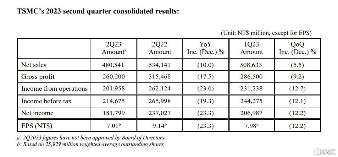 具体来看,截至 2023 年6月30日的第二季度营收为4808.4 亿新台币 ,同比下滑10%,环比下滑5.5%。以美元计算,第二季度营收为156.8亿美元,同比下降13.7%,环比下降6.2%。