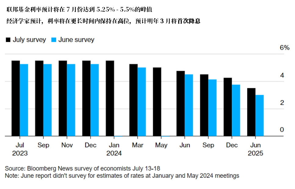 彭博社于7月13日至18日对45名经济学家进行的调查显示,大多数受访者预计,美联储将在下周再次加息,然后结束这轮40年来最激进、为期16个月的加息周期。